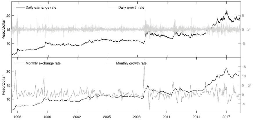 In this section, the statistical moments and plots of the nominal exchange rate (Peso/Dollar) are discussed. The data is studied in exchange growth rates at different frequencies (i.e., daily and monthly data) from April 1995 to May 2018. The analysis suggests that independent of the frequency, the nominal exchange rates are not stationary time series, and the sample moments present changes over time.