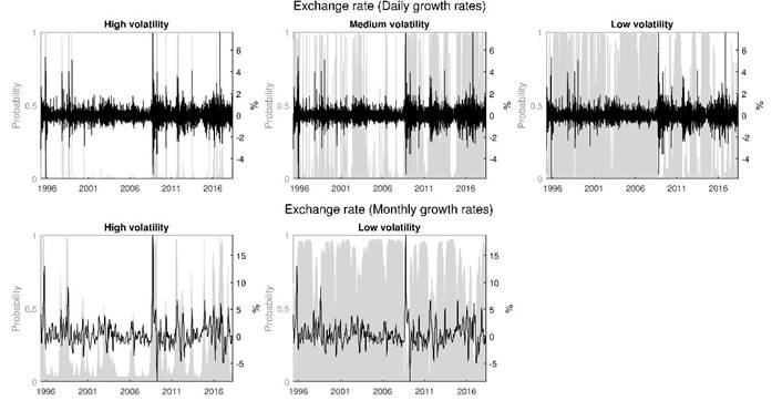 Finally, this study attempts to motivate that future research about financial issues of explanation of shocks and changes in volatility, co-movements in economic variables, determinants and inference in the Mexican exchange market, should be based on models with non-constant parameters over time. Therefore, we should be careful with the Mexican exchange rate econometric modeling (co-integration, unit root test, VAR model, GARCH and structural models). This, because the economic implications might be state dependent, and a misspecified econometric model might lead to different inferences that support the conclusions. Finally, model comparison and inference under GARCH and ARFIMA models in MS frameworks are left for future research.