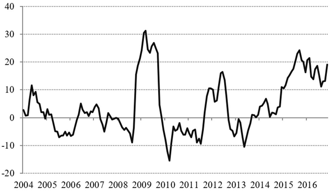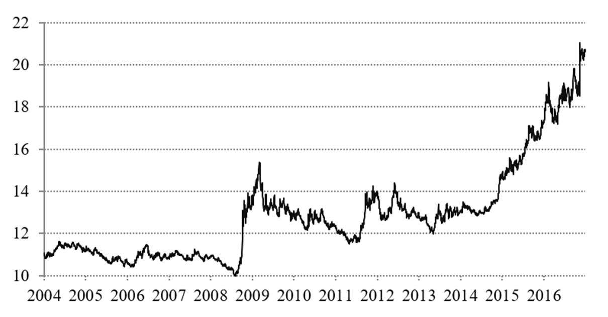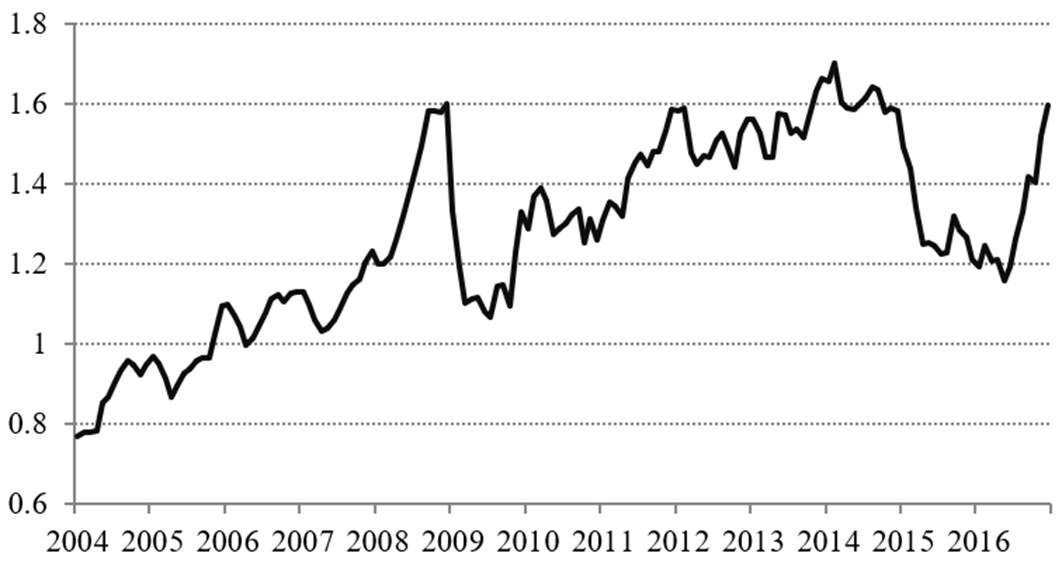 Existe una abundante literatura sobre la alta dependencia comercial del sector manufacturero en México con el ciclo económico de Estados Unidos (Torres Vela (2003), Hanson, (2003); Cañas et al (2013)). Dicha dependencia, ha provocado que las nuevas políticas proteccionistas de Estados Unidos llevarán a una rápida depreciación del peso, lo que provocó que el peso alcanzara un máximo histórico de 22 pesos por dólar en enero de 2017. Debido a la incertidumbre política, indicadores como el EMBI (Riesgo País de Mercados Emergentes), el VIX (Índice de Volatilidad del Mercado de Opciones PUT de Chicago), y el TED spread3, los cuales sufrieron fuertes incrementos, presionando así al tipo de cambio. De acuerdo con Benavides (2016) estas variables son las que más inciden en la prima de riesgo del tipo de cambio.