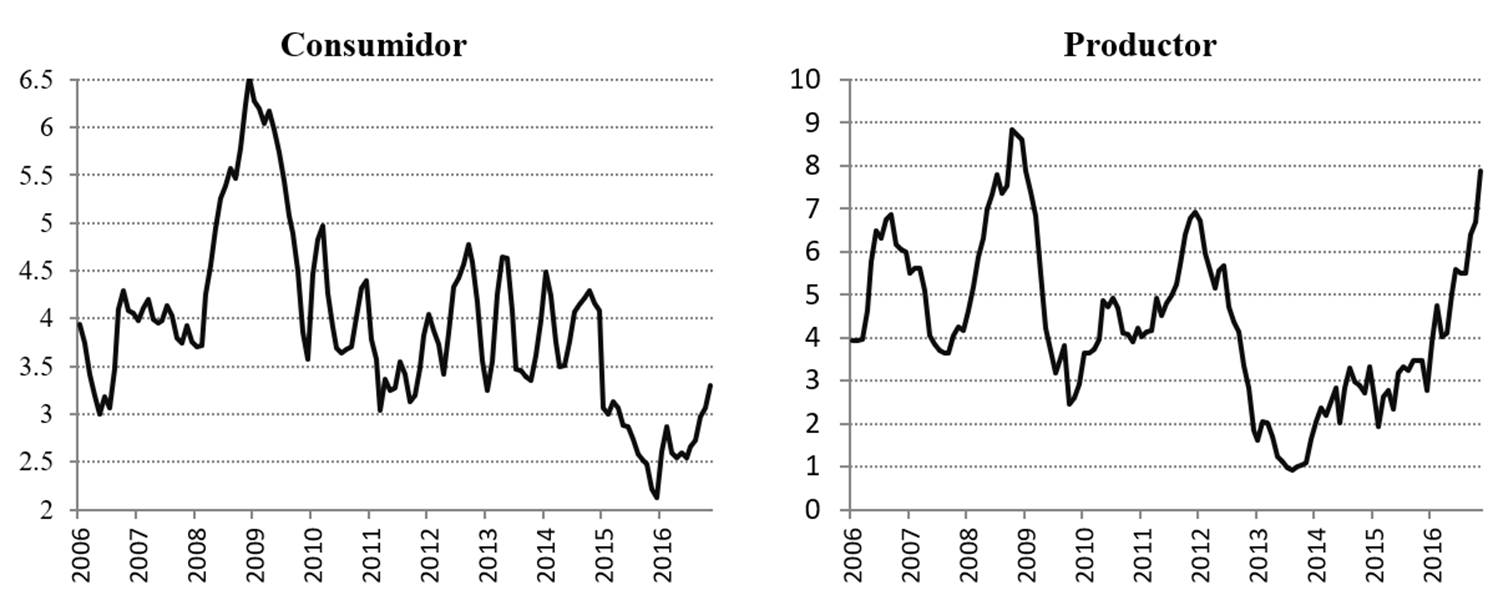Por ejemplo, Hernández y Benavides (2012) a través de un modelo GARCH confirman la hipótesis de que la incertidumbre inflacionaria afecta negativamente al nivel de inflación, por lo cual los bancos centrales modifican su postura monetaria. Con el paso de los años, estos riesgos de inflación han disminuido y ayudado a que la inflación permanezca relativamente estable.
