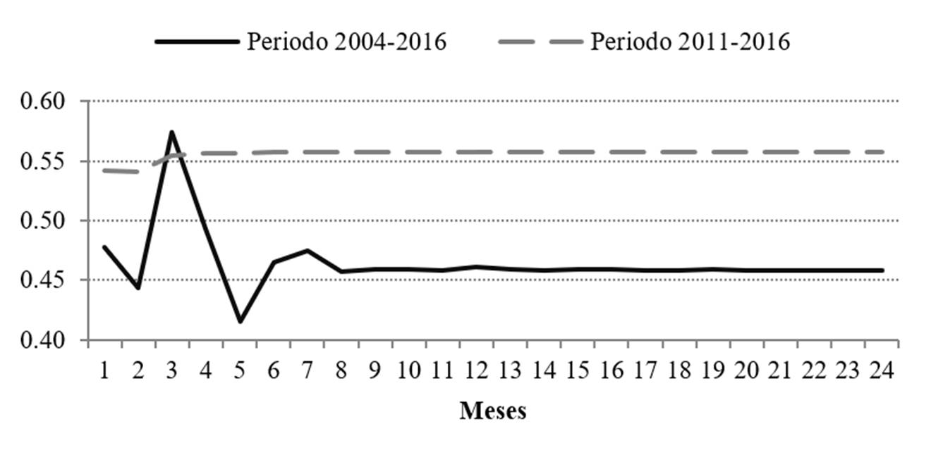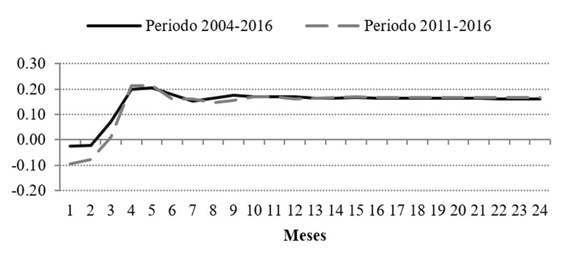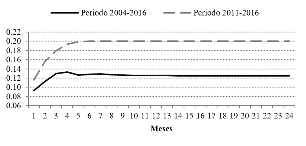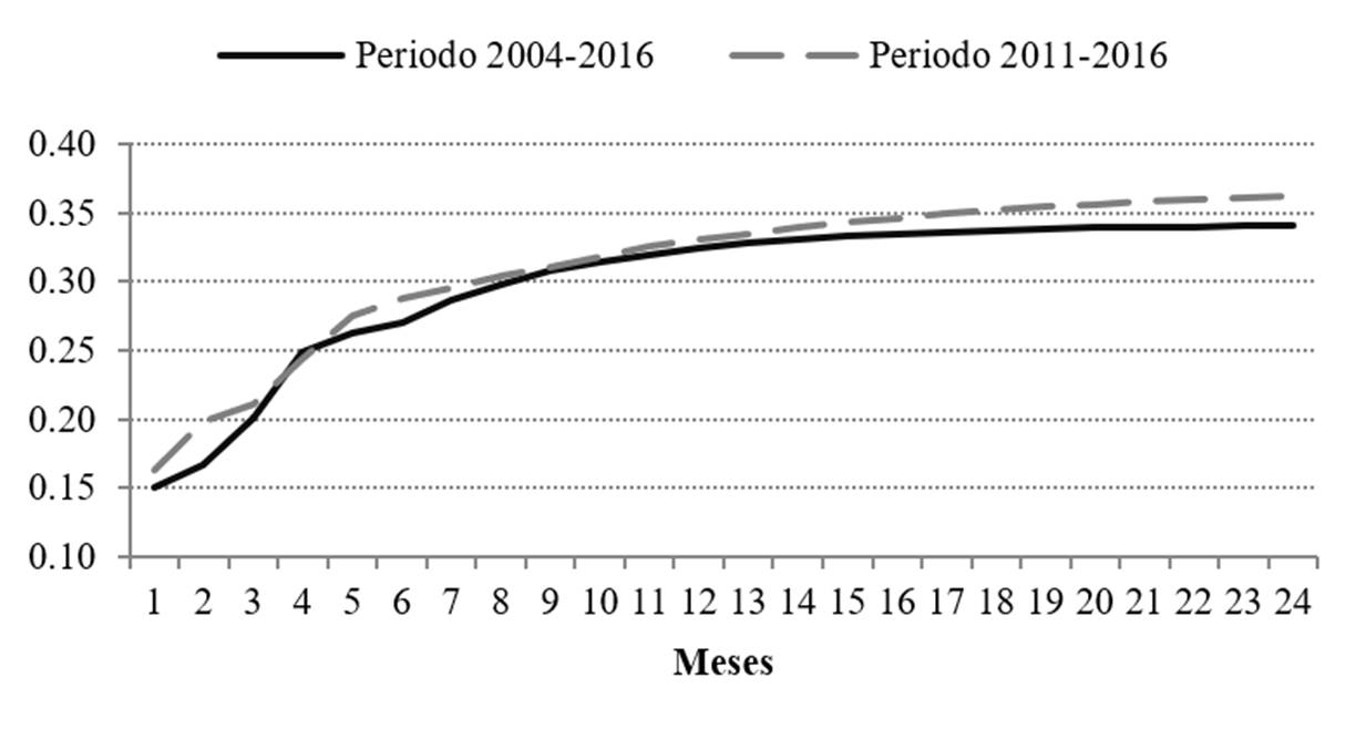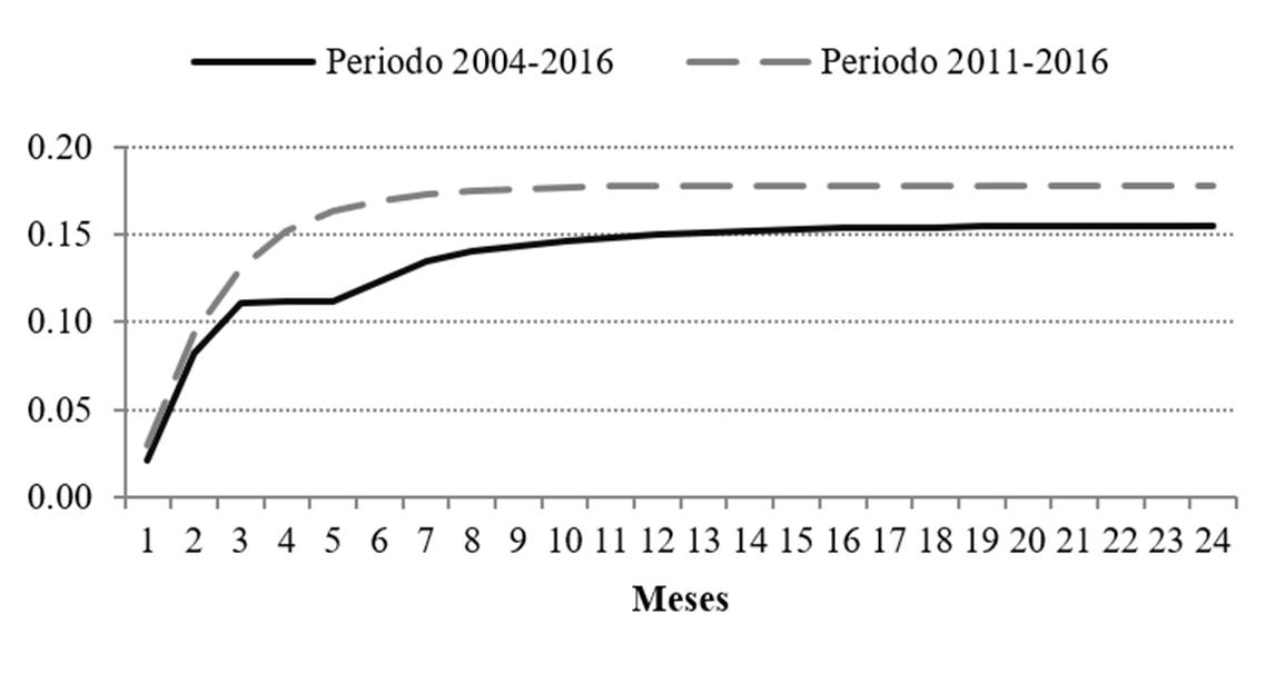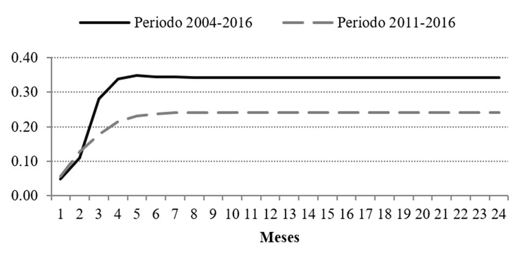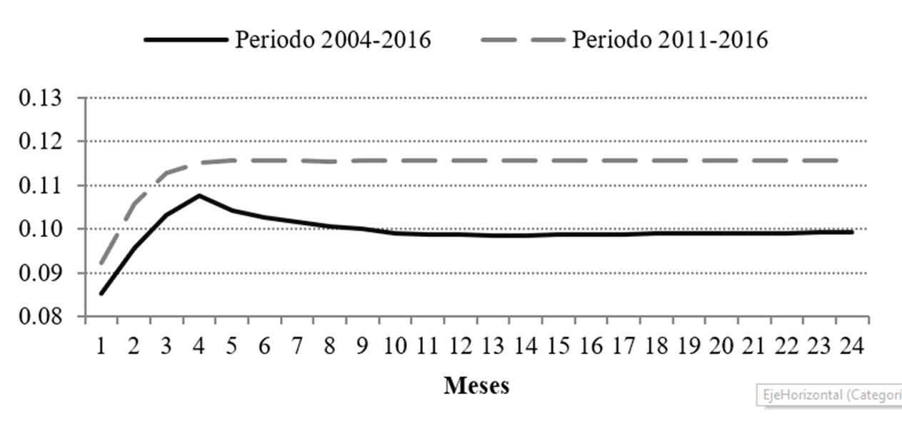 La metodología propuesta consiste en un modelo VAR para el periodo 2004-2016, con datos de frecuencia mensual. Utilizando los resultados de estos modelos, se construyen funciones de impulso respuesta, simulando variaciones de 1 por ciento en el tipo de cambio como impulso a los distintos precios.