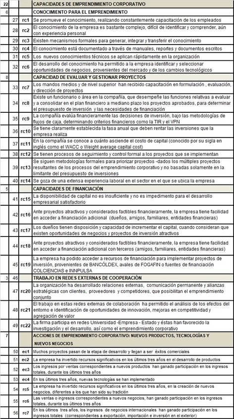El cuestionario se estructura con respuestas a las preguntas en escala Likert; para encontrar las variables a analizar en el estudio, la encuesta se estructuró con 55 variables observables y que posteriormente integran las tres variables latentes, validadas en el análisis factorial: OE, que comprende 26 preguntas; las capacidades, denominadas Recursos y Capacidades -RECCAP, que incluye 22 preguntas; por último, las acciones de emprendimiento en que se concreta el EC, con 7 preguntas.